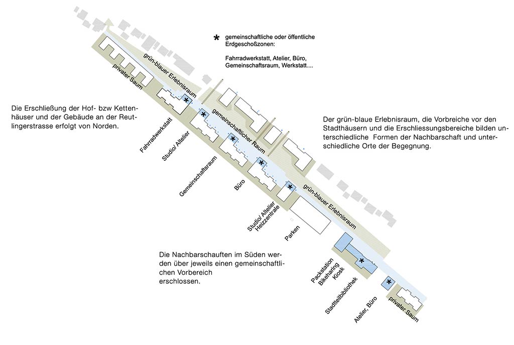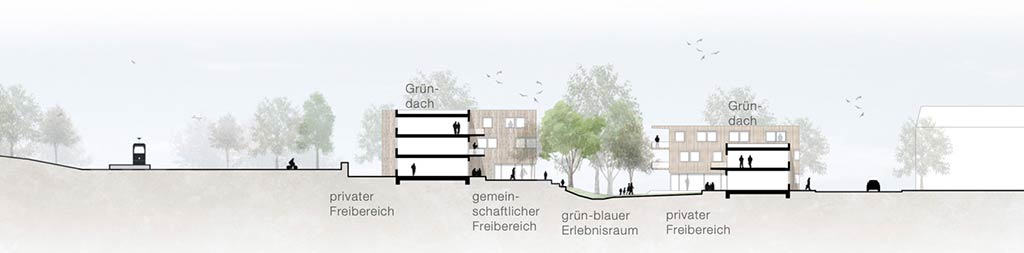 „Die Freiraumgestaltung fasst die teils heterogene Bestandssituation zu einem klar lesbaren und erlebbaren Konzept zusammen und bildet die gestalterische Basis für das neue Wohnquartier. Im Zuge der Neugestaltung werden die unbebauten Flächen in drei grundlegende Bereiche gegliedert: Öffentliche Flächen, gemeinschaftliche Flächen und das private Grün umgebend der Bebauung. In diesen Bereichen entstehen unterschiedlichste, qualitätsvolle Freiräume, die die Bestandsflächen miteinbinden und Angebote für alle Nutzer schaffen.